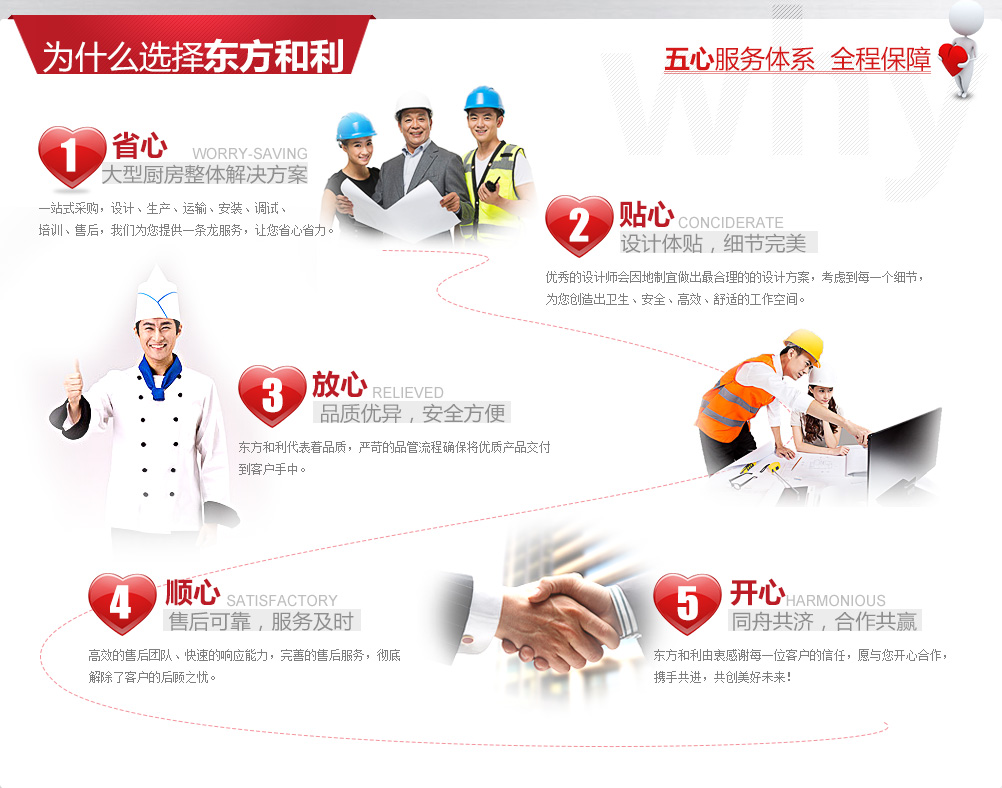 廚房工程建設是一項龐大復雜的系統(tǒng)工程,既需要與后勤工作人員、廚師溝通協(xié)調(diào), 又要與土建、裝修、機電、暖通等工程人員相互配合,工作量十分巨大。同時還要采購眾多的食品機械、工具,這對沒有相關經(jīng)驗的我們來說確實是一個挑戰(zhàn)。有時候我們面對廚師提出的長長的采購需求清單就已經(jīng)眼花繚亂了。 幸好東方和利提供的是整體解決方案,從前期的設計咨詢到后期的安裝調(diào)試、從大型設備到餐具小件,包括各種食品機械,排煙通風,這些瑣碎事情都由東方和利來完成,為我們提供量身定制的解決方案。一站式采購為我們節(jié)省了大量精力,而且所有廚具都由東方和利來保修,對我們來說也更加方便。總之,東方和利的服務讓我們非常省心,我很滿意。